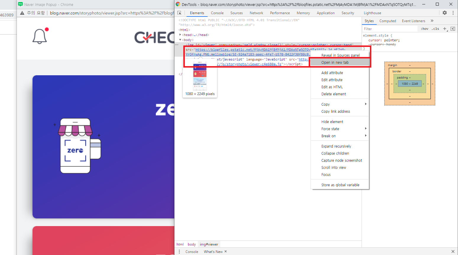 - 개발자 모드가 활성화가 되면 해당 이미지 태그(붉은색 표시)를 찾아 오른쪽 마우스 클릭 후 "Open in new tab"을 클릭합니다.
