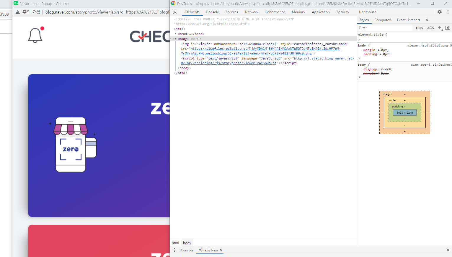 - 원본보기 팝업창을 띄어놓은 상태에서 개발자 모드 실행을 위해 키보드 F12(윈도우) / option + command + i(맥)를 눌러줍니다.