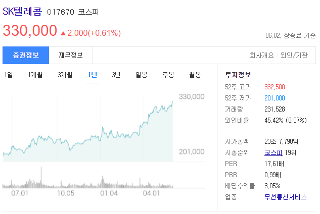 | 주주현황 | SK 4인(30.0%), 국민연금공단(10.8%) 케이티(5.3%), 자사주(1.2%) |